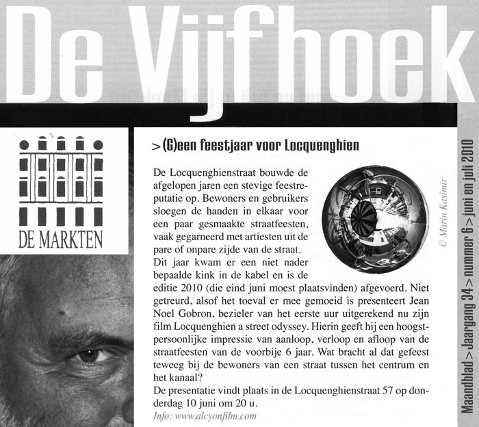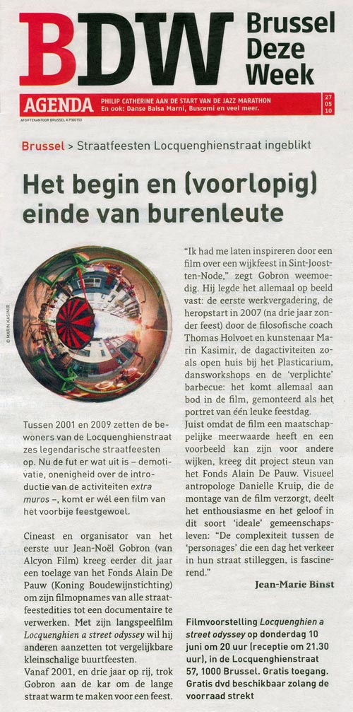 Ce film témoigne des six fêtes ayant eu lieu dans une rue bruxelloise entre 2001 et 2009. Depuis 2001 les habitants organisent une fête dans la rue Locquenghien, située au centre de Bruxelles, près du canal. Par cette fête ils veulent briser l'anonymat de la ville, faire la connaissance des voisins et s'approprier l'espace public. Le film retrace les préparatifs et les activités diverses autour de la fête.